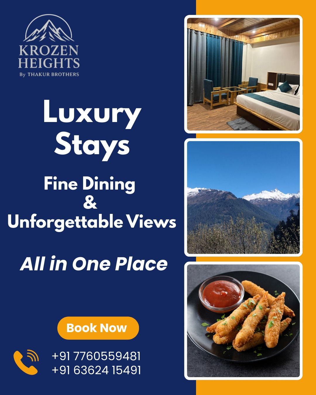 Krozen Heights by Thakur Brothersis the best hotel in Kanyal Road, Manali. We offer cozy mountain-view stays, warm hospitality, modern amenities, and an in-house dine-in restaurant—perfect for families, couples, and groups seeking comfort, great food, and a peaceful mountain getaway. For more information, you may explore our website.
