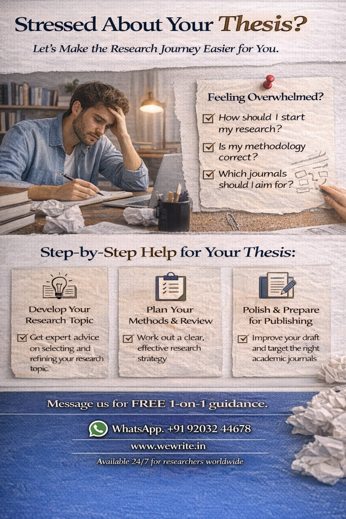WeWrite provides expert academic guidance for PhD and Master’s students. We support thesis writing, literature review, research methodology, editing, formatting, and journal publication to help researchers complete their work with confidence.