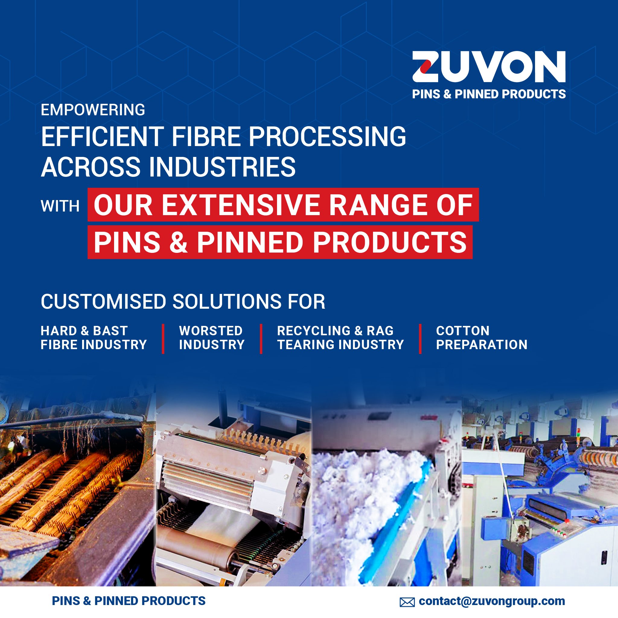 Zuvon Group is a leading Precision Pin Manufacturer in India, specializing in high-quality pins and pinned products for textile and fibre processing industries worldwide. With decades of expertise in precision engineering, we manufacture durable and performance-driven components for cotton preparation, spinning, recycling, hard bast fibre, wool, and other industrial applications. Our advanced manufacturing capabilities ensure consistent quality, long service life, and reliable compatibility with modern textile machinery. Trusted by global mills and OEMs, Zuvon Group delivers precision-engineered solutions that enhance processing efficiency, reduce downtime, and support sustainable textile production.
